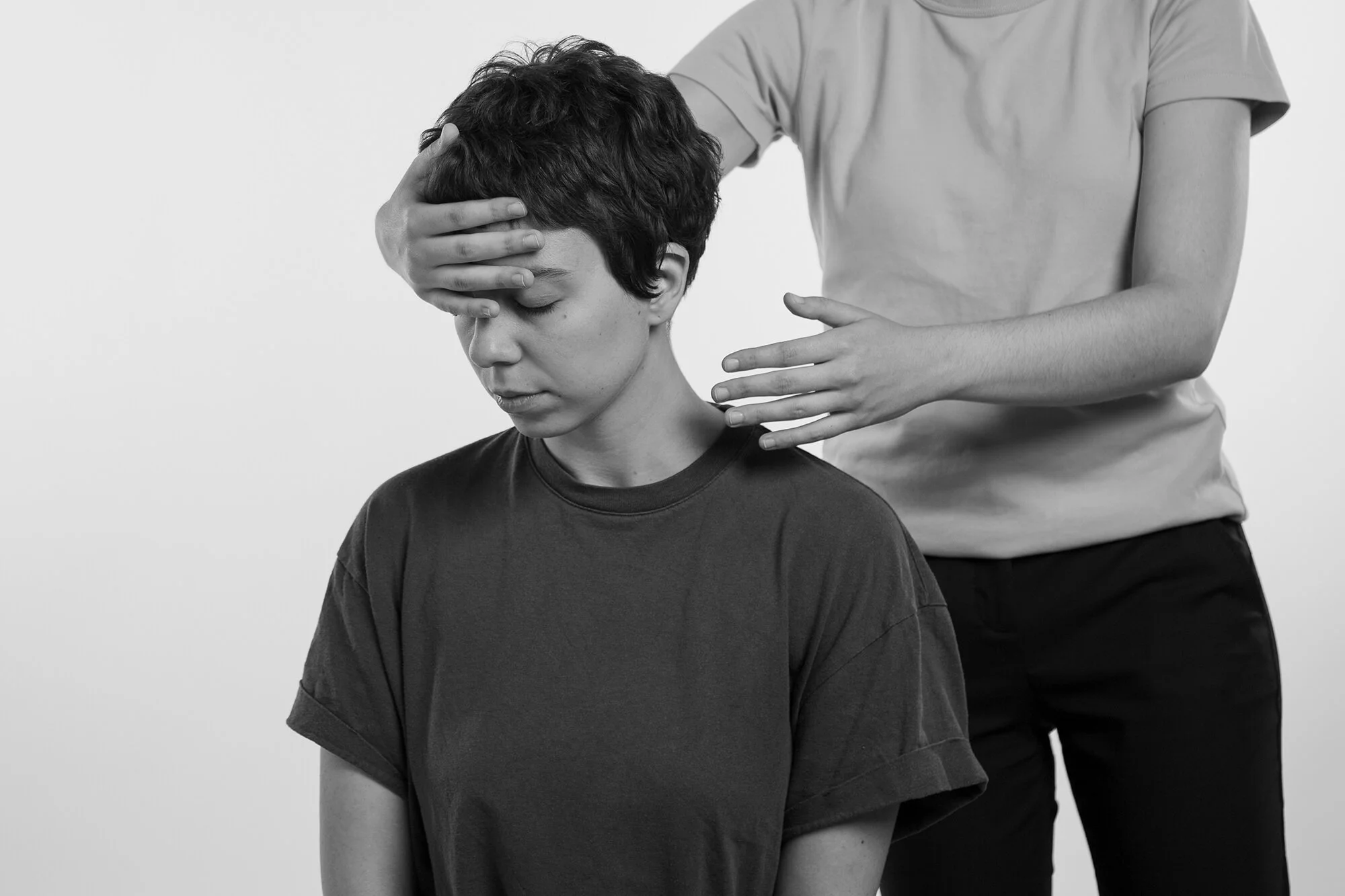 Non-Conforming Bodies examines representations of chronic pain through visual imagery, informed by the artist's own experience. It is comprised of photographs, videos and sound design. The work investigates the collective experience and how biological, psychological and societal elements intersect and influence our understanding of pain. The participants reinterpret long term physical pain through improvised performances based on somatic movements. Body movements and postures work as a way to explore, re-imagine and visualise physical and mental manifestations that are often invisible. In addition, interpretative gestures where a second person appears in the photographs allude to the intricate relationships between the pain sufferer and people assisting them. Through a performative practice, the series aims to re-think the concept of chronic pain and open up channels for empathy.